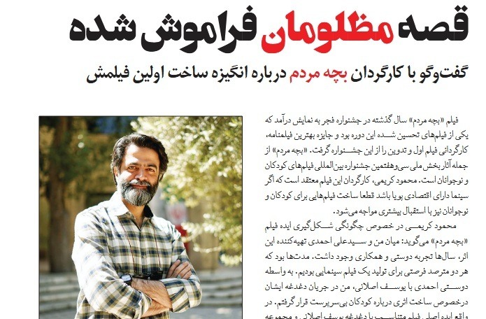 فیلم «بچه مردم» سال گذشته در جشنواره فجر به نمایش درآمد که یکی از فیلمهای تحسینشده این دوره بود و جایزه بهترین فیلمنامه، کارگردانی فیلم اول و تدوین را از این جشنواره گرفت. «بچه مردم» از جمله آثار بخش ملی سی و هفتمین جشنواره بینالمللی فیلمهای کودکان و نوجوانان است. محمود کریمی کارگردان این فیلم معتقد است که اگر سینما دارای اقتصادی پویا باشد، قطعا ساخت فیلمهایی برای کودکان و نوجوانان نیز با استقبال بیشتری مواجه میشود.